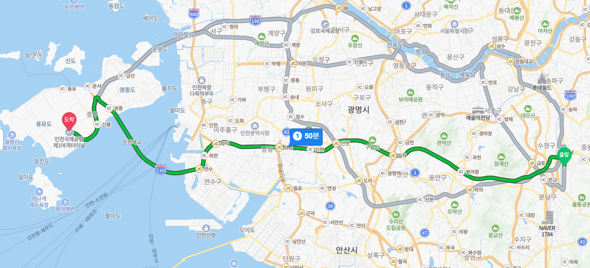 야탑역에서 인천공항까지 공항버스를 이용할 경우 1 터미널까지는 지도상으로는 50분이나, 공항버스 경로 상 1시간 30분, 2터미널까지는 최대 1시간 45분 정도 소요됩니다. 물론 출발하는 시간대의 교통이 혼잡할 경우 더 걸릴 수는 있습니다. 또한 공항버스가 고장나거나 만약 교통사고가 나더라도 대응할 수 있어야 하기 때문에 저는 여러분께 공항에 적어도 3시간 전에 도착할 수 있도록 공항버스 탑승시간을 정하시면 좋을 것 같습니다. 예를 들어 저는 저번 미국 출장 시 09시 이륙 항공편을 탑승하기 위해 06시까지 공항에 도착해야 한다고 생각했고, 대한항공은 2터미널을 이용하기 때문에 야탑역에서 04시 20분에 출발하는 공항버스를 예매했습니다. 공항에 도착하시면 출국 수속하시는데 생각보다 시간이 소요되고, 출국 수속장에서 항공기 탑승 위치까지 거리가 멀 경우 자칫 항공기를 못타는 불행한 상황이 생길 수도 있으므로 반드시 여유있게 공항에 도착하시기를 추천드립니다.