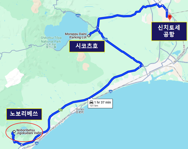 노보리베쓰 지옥계곡은 지금도 뜨거운 증기와 유황 냄새를 뿜어내고 있으며, 수많은 분기공과 수증기가 나오는 용출구가 있다고 합니다. 미국에 있을 때 Yellowstone 국립공원 방문했는데, 그 때도 수많은 용출구에서 특정 시간마다 수증기가 높게 올라오는 것을 보고 자연의 위대함을 느꼈는데, 이번에도 지옥밸리를 방문하면 그 때와 비슷한 모습과 감동을 받을 수 있을 것 같습니다. 이 곳에서 나오는 뜨거운 온천수가 어제 제가 숙박했던 호텔의 온천수라고 합니다. 제가 숙박한 호텔에서 지옥계곡은 걸어서 갈 수 있으며, 산책로가 잘 조성되어 있어 안전하게 계곡을 둘러볼 수 있습니다. 지옥계곡을 둘러보는 다양한 코스가 있으나 저희는 다음 일정을 위해 10~30분 정도의 산책로만 방문하여 사진을 많이 찍고 올 예정입니다. 계곡에서 안쪽으로 조금만 더 들어가면 오유누마라는 거대한 온천 연못이 있습니다. 이 오유누마 길을 따라가다보면 천연 족욕탕도 있다고 하는데 만약 시간이 되면 경험해 보고 오겠습니다. 하지만 노보리베쓰에서 신치토세 공항까지는 약 1시간 20분 정도 소요될 것으로 보이나, 중간에 시코츠호를 둘러볼 예정이므로 빠르게 이동하도록 하겠습니다.